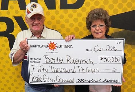 »Photo: Bertie Raemsch of Lothian, with her husband Kenneth by her side, collected her latest big scratch-off prize of $50,000. Courtesy of Maryland Lottery