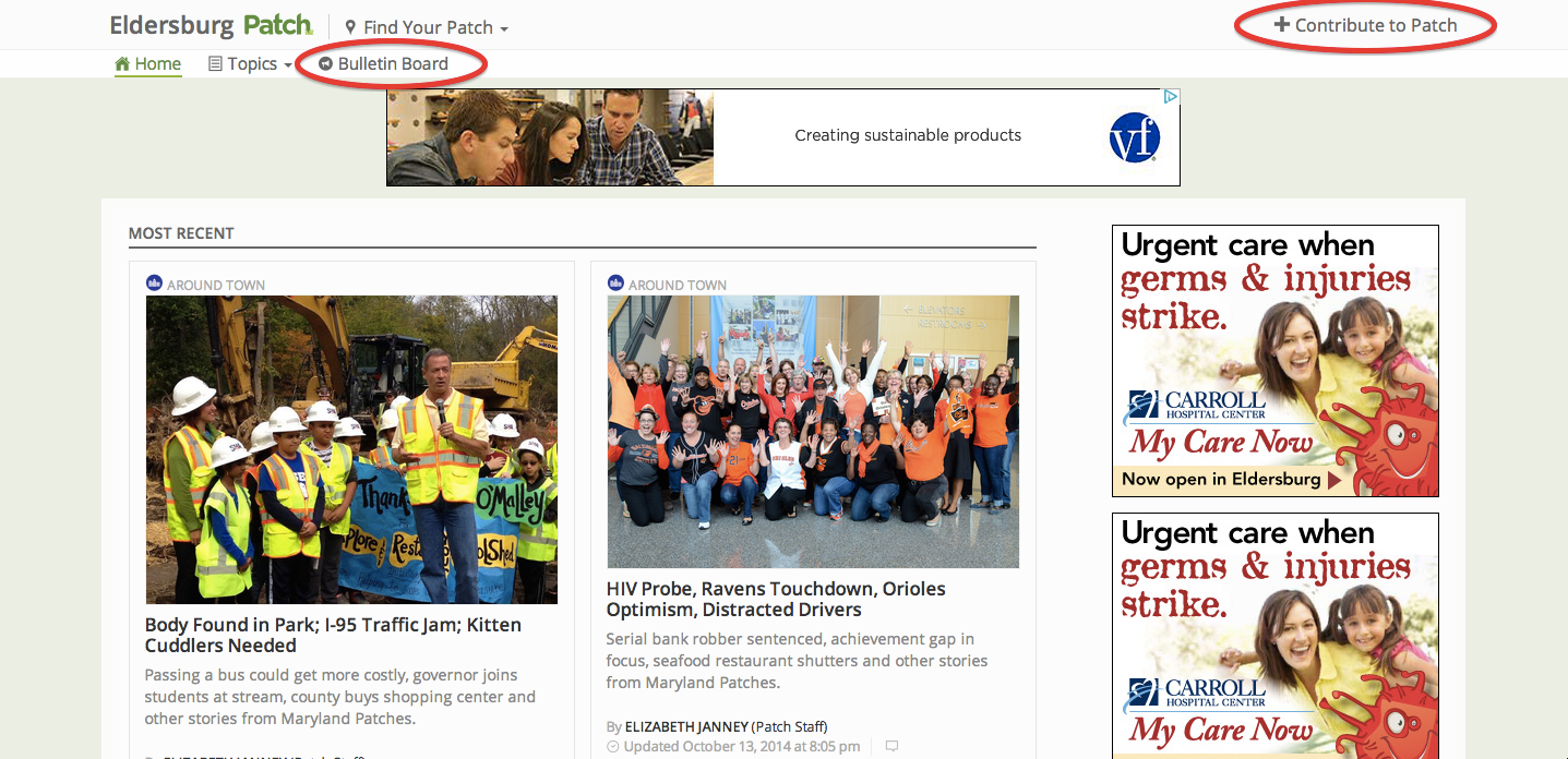Two user-interaction opportunities are found on the home page of every Patch. They’re circled in red: “Bulletin Board” and “Contribute to Patch.” (Screenshot: Patch.com)