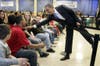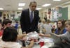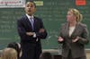 At 10:15 a.m., Obama entered an eighth-grade science class and was introduced by teacher Susan Yoder. The 29 students were clustered at several tables with what looked to be Jiffy Pop popcorn containers, except they were rectangular. They were models of the Chesapeake Bay watershed, showing how pollutants enter the bay.