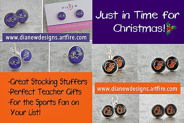 Baltimore Raven’s Earrings & Rings- Just in Time for Christmas. VERY Affordable! Choose from 3 styles of earrings-Silver tone posts, silver tone dangle lever back, or antiqued brass posts. And an adjustable ring in silver tone. Earrings - $5.99 and the ring- $4.99. A set of earrings and ring a- $9.99. All Nickel & Lead Free. You may find and purchase these items & MORE at www.dianewdesigns.artfire.com PayPal & Credit Card accepted- or email at dwillinghan@verizon.net