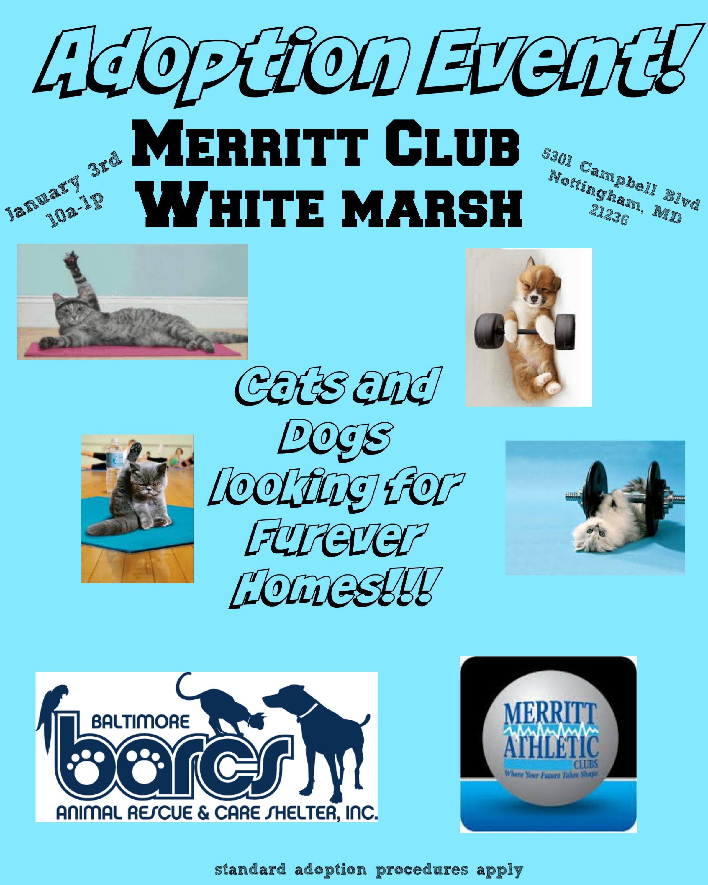 BARCS is having a Dog and Cat adoption event at the Merritt Athletic Club White Marsh 1/3/2016 from 10 a.m. until 1 p.m.
