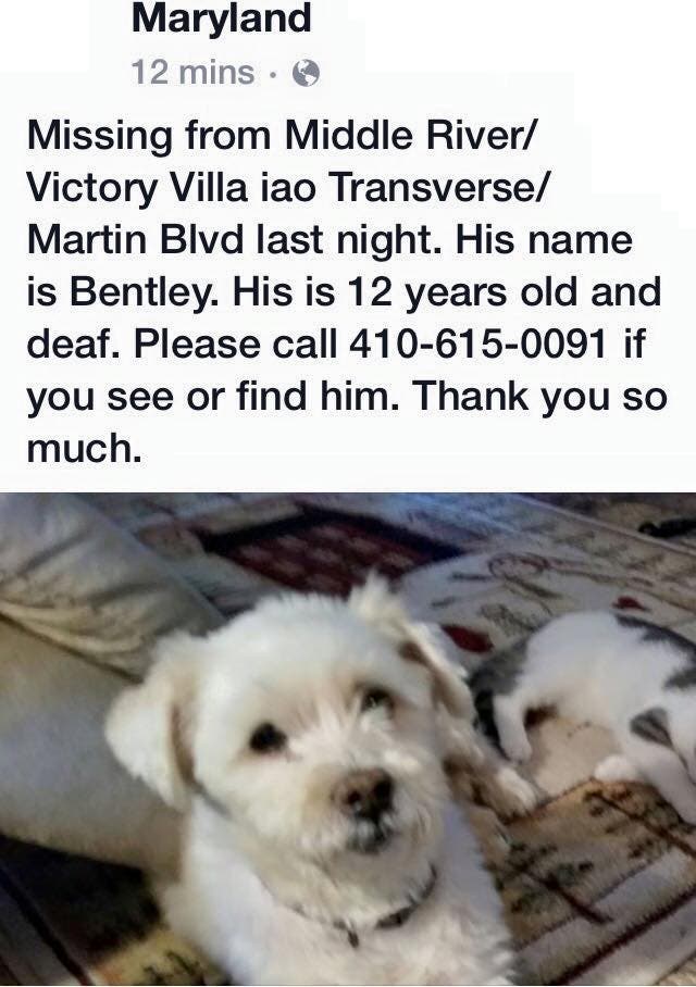 “Missing from Middle River/Victory Villa iao Transverse/Martin Blvd last night. His name is Bentley. He is 12 years old and deaf. Please call 410-615-0091 if you see or find him. Thank you so much.”