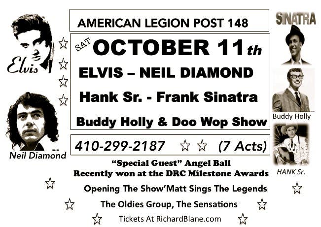 A great show full of talented tribute artist will perform at Post 148. This show is open to the public. Come enjoy the music of the great Legends of yesterday. Tickets on sale at the Legion Bar or online at Richardblane.com,