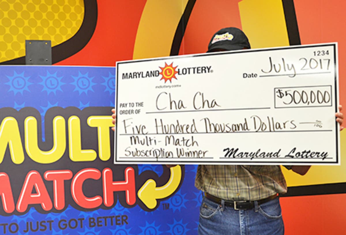 PHOTO: Gaithersburg resident “Cha Cha,” a nickname only the winner’s wife will recognize, celebrates his $500,000 Multi-Match subscription win. Courtesy of the Maryland Lottery
