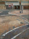 The painting makes use of a distorted perspective, significantly foreshortening the crosswalks leading up to the muted train station in the background albeit its potentially mundane subject matter.