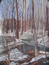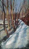 In some of her more traditional works, the cartoon format and stenciled letterforms yields to a Euclidian sense of space that defines a recognizable place and a setting rather than a narrative that is unraveling before our very eyes. Her more representational work, including snow landscapes invites the viewer into the place she constructs through the rules of perspective and foreshortening.
