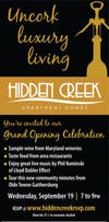 Hidden Creek Apartment homes is celebrating their grand opening and you are invited. Wednesday, September 19 from 7 to 9 p.m., join us for an evening of complimentary wine from Maryland wineries, food from area restaurants and live music from Phil Kominski of Lloyd Dobler Effect.