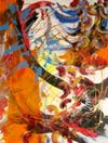 Mood has a lot to do with her creative process. Lately, a faddish intrigue with dance music has informed her color choices: large bright blocks with dark contrasts. Also, if it’s flammable, it’s destined for the canvas. She melts materials — crayons are the usual suspects — to build texture beneath layers of paint.