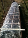 For protecting a 4’ x 4’ raised bed you can easily use two 10’ lengths of PVC pipe. You will put one end of each pipe in an opposite corner and use a cable tie (zip tie) to connect the two pipes (see photo). Then you can use a variety of materials to protect your bed—a sheet if it’s just going to be chilly and plastic and thick blankets for a freeze.