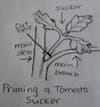 So, how do you prune a tomato? If you look at the drawing above, you’ll see that there are main branches that grow at an angle from the main stem. Occasionally you will see something growing in the “crotch” of the “Y." This is called a sucker. If you get this sucker growth early, you can pinch it off with the fingernail of your index finger and your thumb. If it’s larger than 4” in length I’d suggest cutting the sucker with scissors or a sharp knife so you don’t damage the main stem or the branch. This is a task you should perform every week.