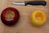 To begin, get a small knife and cut out the core of the apple. Be sure not to go all the way down through the bottom. Leave a half inch or so at the bottom of the apple. This will give some support so your apple won't fall apart and the chocolate filling won't leak out all over the grill.
