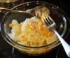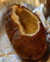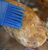 Notice how the butter really helps the salt stick to the potato! I think this is similar to how the potatoes are made at Outback Steakhouse. After about an hour or so your potato should be fully cooked. Cut off the top ¼ inch of the potato and take a spoon and scoop all the insides of the potato into a small bowl. This leaves a hollow potato that is ready for the filling. See the image I have attached.