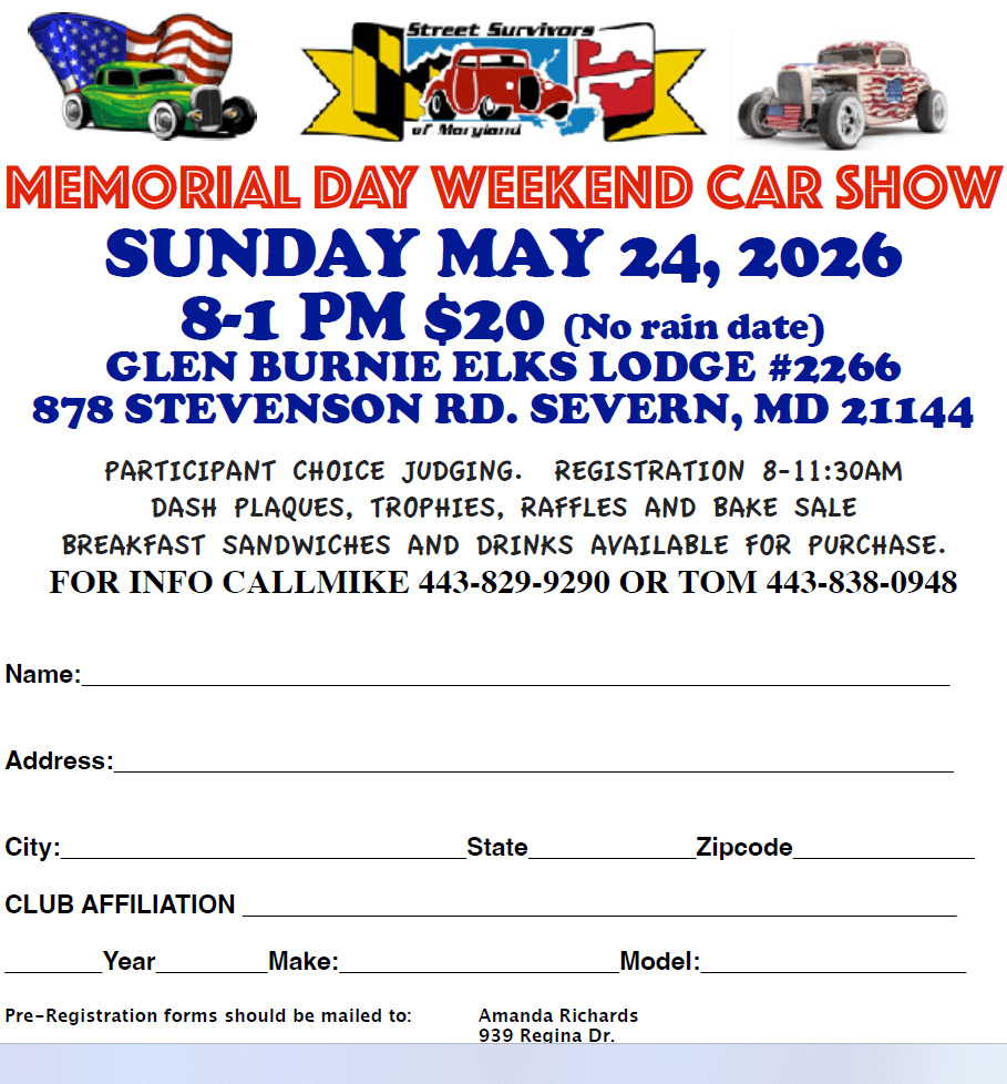 Glen Burnie|Local EventHosted By Street Survivors of Maryland Car ClubCHARLENE WASHINGTON, NeighborMay24Event DetailsSun, May 24, 2026 at 8:00 AMAdd to calendarMemorial Day Car ShowCar ShowShare