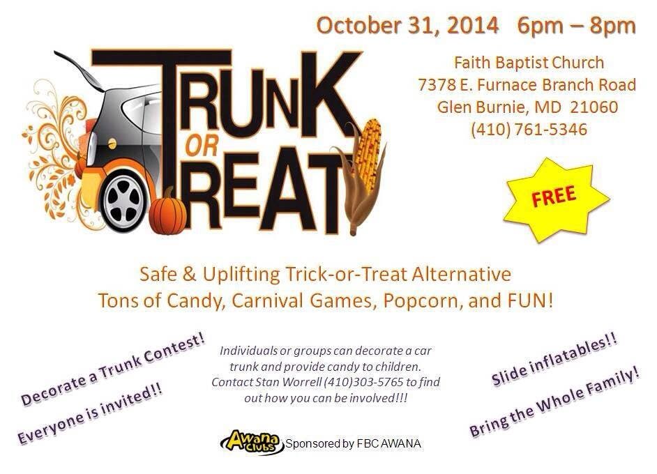 Faith Baptist Church Awana is hosting its 3rd annual Trunk or Treat event on Halloween night from 6 to 8 p.m. at Faith Baptist Church in Glen Burnie, MD. This safe, family friendly alternative to conventional trick or treating has been a great success and lots of fun for our neighbors and friends in Glen Burnie and surrounding areas. Tons of candy, inflatables, games, music, food and fun - along with an appearance this year by the Baltimore Raven mascot Poe - await all our little trunk or treaters. We look forward to seeing you all again this year and meeting new friends so please help us spread the word.