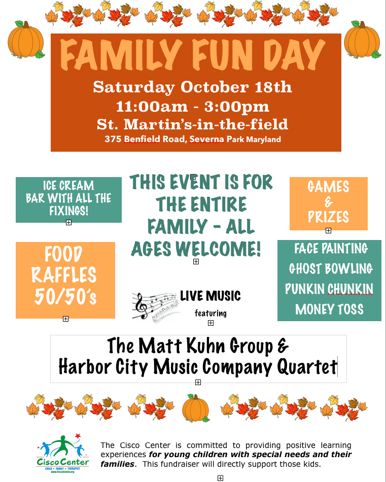 The Cisco Center is having a fall fundraiser for all ages at St. Martin’s-in-the-field in Severna Park (375 Benfield Blvd). The fun starts at 11:00am and ends at 3:00pm. There will be live music provided by The Matt Kuhn Group, a local band featuring Matt Kuhn on guitar and vocals, Lee Kleiman on drums and Paul Beardmore on bass. There is a quartet coming from the internationally renowned Harbor City Music Company show chorus to perform at 1:30pm. There will be loads of games and prizes including the popular Punkin’ Chunkin’, face painting, ghost bowling, and much much more. Food vendors will be onsite as well as snacks, drinks and a special ice cream sundae bar. Tables can be rented for $20 to advertise your business or sell your products. Please bring the entire family and support the kids at the Cisco Center!