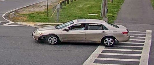 The suspect is described as a man in his 30s with a beard and small "twist" style braids. A gold Honda Accord pictured below was used as the getaway vehicle in both robberies. Detectives point out damage on the front driver's side of the car.