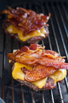 Get the grill going for a medium or medium high heat. Place the burgers directly over the flame. Once the burgers are almost done move them away from the fire, get out the cheddar cheese and cooked bacon and put it right on top of the burger. I like to do this on the grill over indirect heat (no flame underneath). This melts the cheese and warms up the bacon without burning or overcooking the burger.