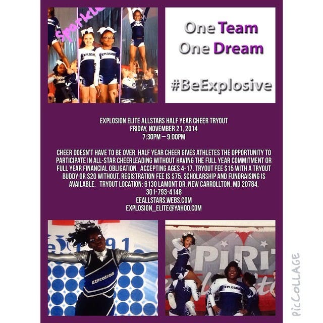 Get ready to #beexplosive by joining one of the hottest competitive cheer programs in the DMV. Half Year tryouts this Friday 11/21. Private Tryouts available. No experience needed ages 4-18. We are looking for girl interested in taking cheerleading to the next level. Dont forget to pass the word. For Details or more information call 301-793-4148 or email: explosion_elite@yahoo.com