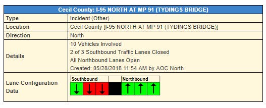 A 10-vehicle crash occurred on I-95 north at mile post 91 on the Tydings Bridge on Memorial Day, according to state transportation officials. The collision happened just before noon.