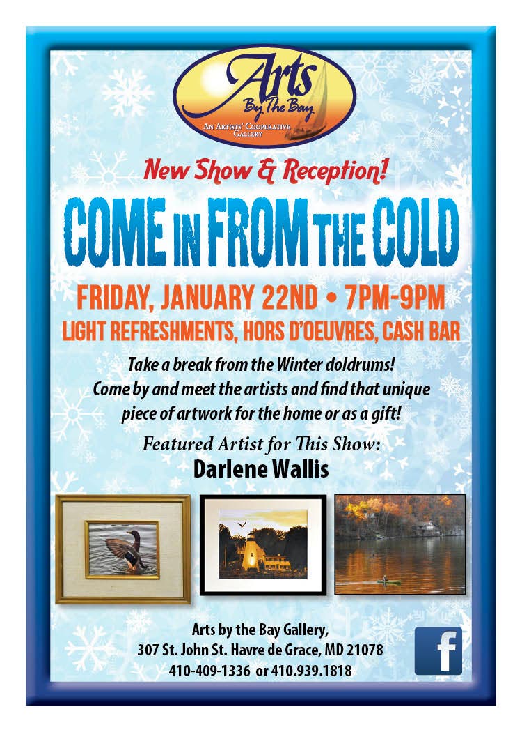 Mark your calendars for Arts by the Bay “Come in from the Cold” Reception and Exhibit Friday January 22nd. Join the artists for an evening of food, drink and fun 7-9 PM. The featured artist for this show is Darlene Wallis.