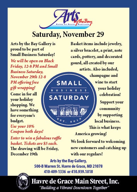 Join Arts by the Bay Gallery for Small Business Saturday - November 29th. We will be open 12- 8 PM. Use your 10% coupon on Black Friday and on Small Business Saturday. We will offer free gift wrapping on all purchases on both days! Get your holiday shopping started!