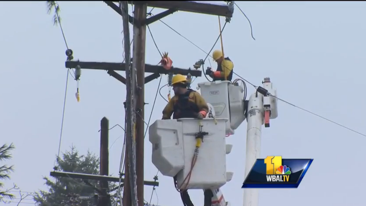 BGE crews worked into the night Monday to restore power to about 22,000 customers, reports WBAL TV. Most of the damage came from tree limbs coated with ice that snapped, dragging down power lines.