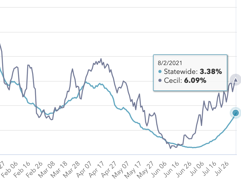 As of Tuesday, the coronavirus positivity rate in Cecil County is nearly double the state average.