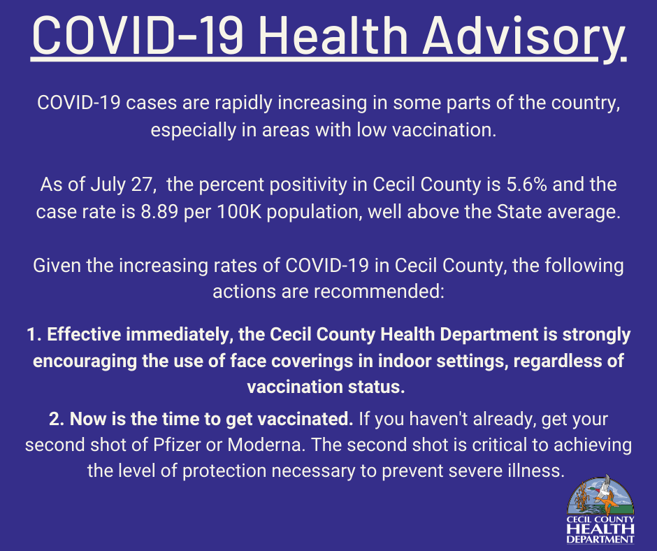 After announcing what it termed an "outbreak of COVID-19 cases associated with the Cecil County Fair," the Cecil County Health Department advised: "Given the increasing cases of COVID-19 in Cecil County, the Health Department strongly encourages the use of face coverings in indoor settings, regardless of vaccination status."