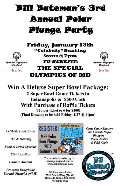 Come out and support the Special Olympics of MD and get an early practice dunk at the 3rd Annual Polar Patio Plunge at Bill Bateman's Bistro in Havre de Grace. There will be drink specials, auctions a dj and more. We hope to see you there!