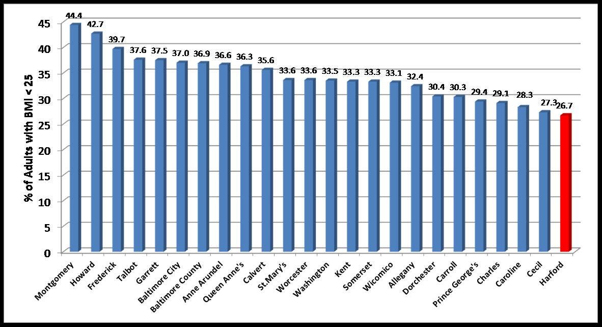 What percentages of adults in Harford County are at a healthy weight? Only 26.7%, lowest of all of the counties in Maryland.