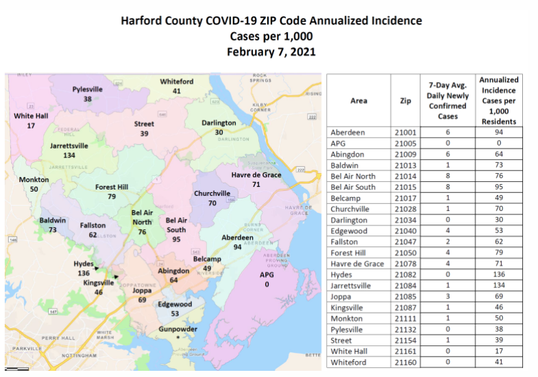Data released Monday shows the case rate for the 21078 ZIP code is now 71 per 1,000 residents.