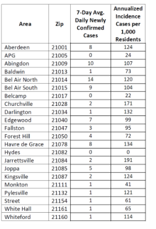 Here is the latest ZIP code data from the Harford County Health Department, which is updated every Monday:
