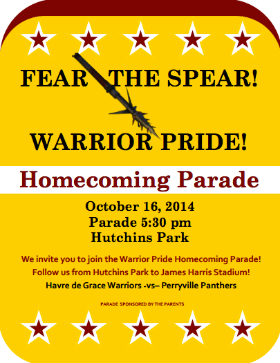 The parade will be at 5:30 p.m. on Thursday, Oct. 16. Afterward, the Havre de Grace High School Warriors will take on the Perryville Panthers at 7 p.m. at Harris Stadium during the homecoming football game.