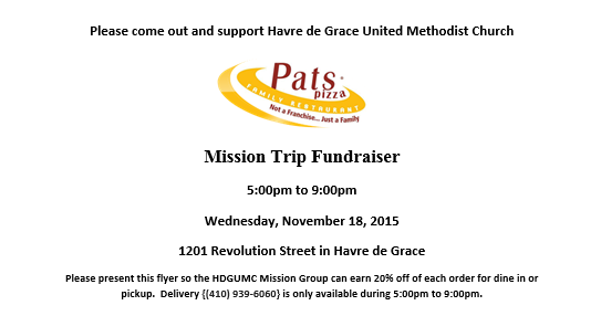 Our next fundraiser will be Wed, Nov. 18th, 5-9 pm at Pat’s Pizza, 1201 Revolution Street, HdG. We will receive 20% towards our mission trip expenses.