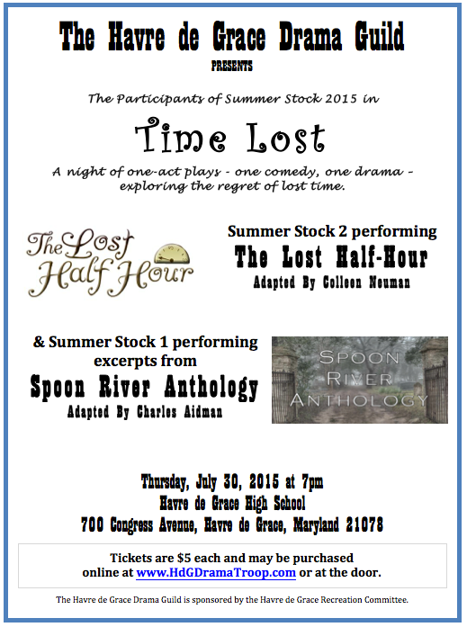 Time flies when you’re having fun, or sometimes even when you’re not. It seems that all too often we look at the clock and wonder “Where has the time gone?” That is the theme of two short plays that will be presented by the Havre de Grace Drama Guild this Thursday night, July 30, at 7 p.m. at the Havre de Grace High School auditorium.