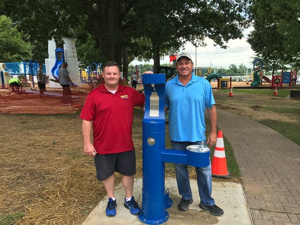 Mayor Martin and Deputy Director of Public Works Joe Conaway stand with the new water fountain at Tydings Park. Photo courtesy of the city of Havre de Grace.