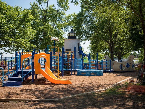 The new playground meets the city's goal of providing an all-access playground that adheres to the Americans with Disabilities Act (ADA) standards. A replica of the Concord Point lighthouse, seven-station play factory, inter-deck step, arch logs, sliding pole, Tic-Tac-Toe, rotating climber, rock-paper-scissors and modern merry-go-round are offered.