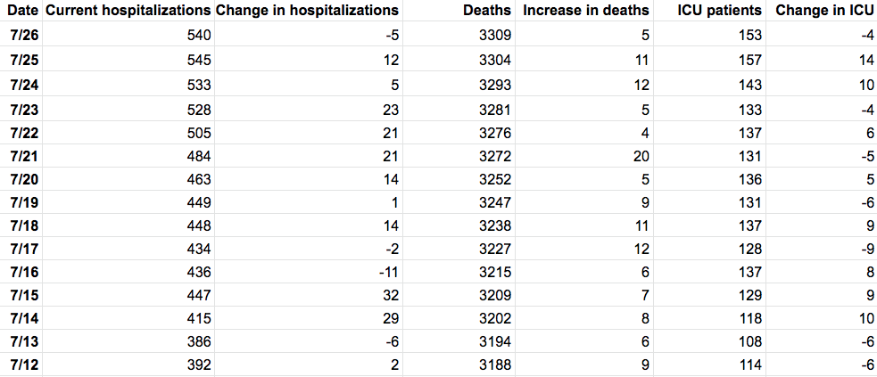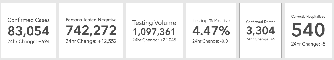 In the last week, the state has seen 4,928 new confirmed cases; 91 hospitalizations; 22 ICU patients; 69 acute care patients; 62 deaths; and 153,508 new coronavirus test results reported. The positivity rate a week ago was 4.46 percent, and officials said Sunday it was 4.47 percent.