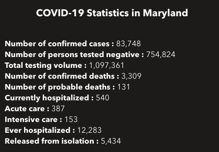There are 83,748 confirmed cases of the coronavirus in Maryland as of Sunday, according to the Maryland Department of Health, which reports 3,309 people have died statewide from COVID-19, the disease caused by the virus.