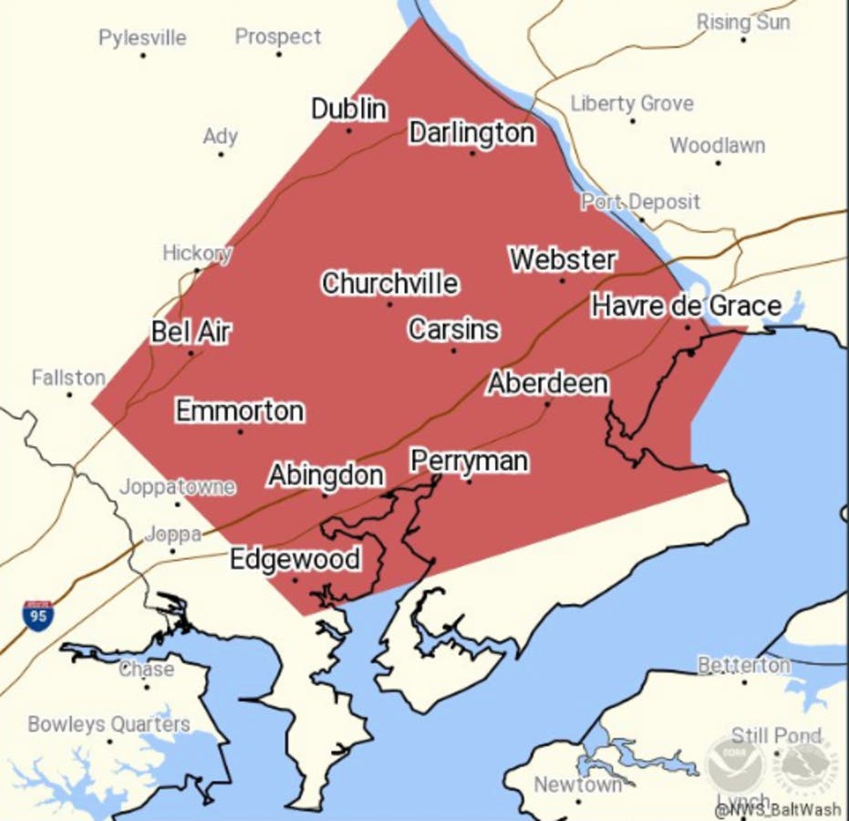 Aberdeen, Edgewood and Havre de Grace in particular may be impacted, according to the National Weather Service, which issued the warning just before 3 p.m.