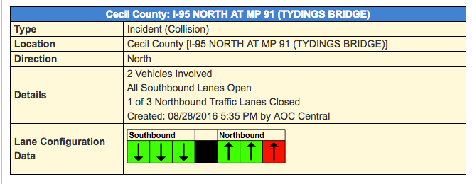The crash occurred on Interstate 95 north past the Tydings Bridge, near mile marker 91; it was reported at approximately 5:35 p.m. and initially resulted in two right lane closures on I-95 north, transportation officials say.