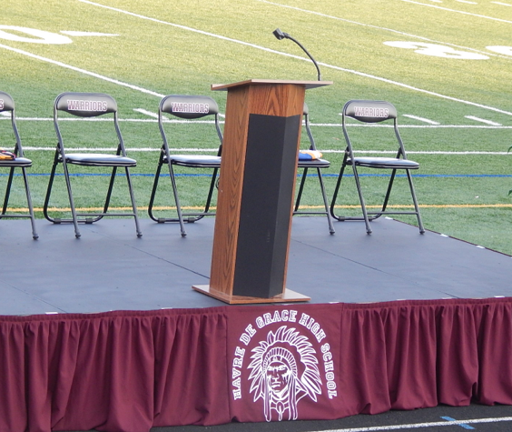 Pictured, stage before the dedication of Harris Stadium at Havre de Grace High School. Photo Credit: Elizabeth Janney.