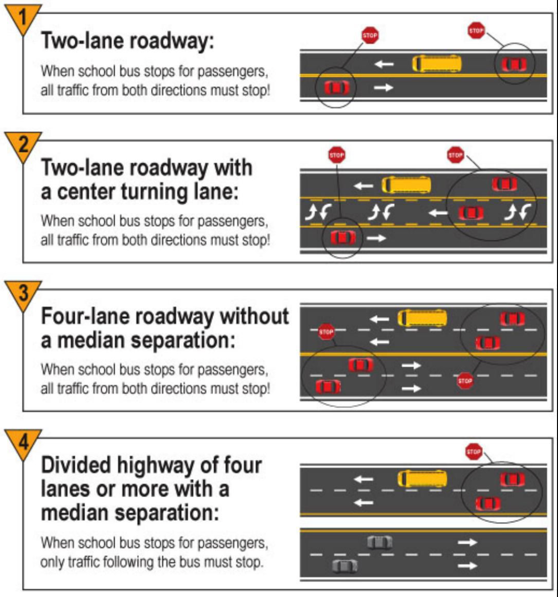 Other than on a highway with a median and at least four lanes, traffic in both directions must stop for a school bus that stops with passengers, according to the sheriff's office.