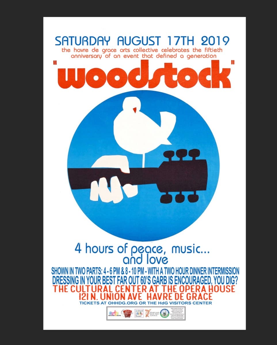 Celebrate the 50th anniversary of Woodstock with the Havre de Grace Arts Collective. The expanded version of the film with hours more of the music will be shown in two parts: 4 pm to 6 pm followed by a two-hour dinner intermission. Film resumes at 8 pm. Only one ticket required. Tickets at OHHdg.org, at the HdG Visitor Center, and at Artists Emporium on Washington St.