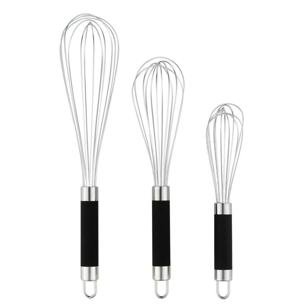 Whisk up something delicious in the kitchen with this set of three different sized whisks. They're made of nonstick, rust-resistant stainless steel and have silicone handles.