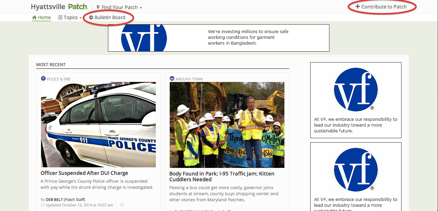 Two user-interaction opportunities are found on the home page of every Patch. They’re circled in red: “Bulletin Board” and “Contribute to Patch.” (Screenshot: Patch.com)