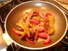 - Cut the peppers and the white onion into strips and sauté in a sauce pan with the remaining olive oil until the onions are translucent.