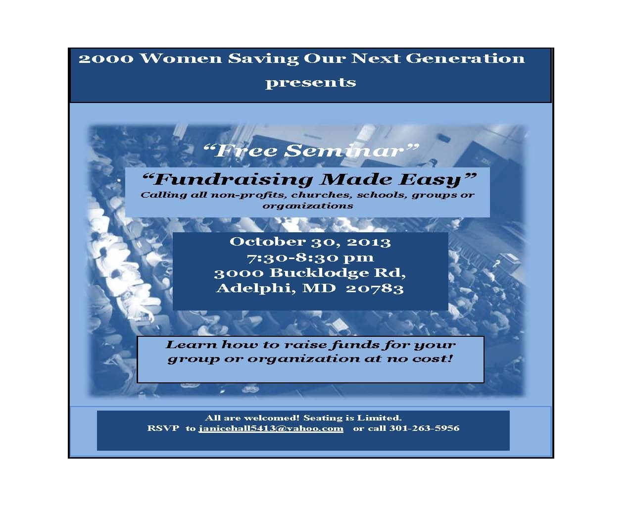 2000 Women Saving Our Next Generation is sponsoring is a free seminar to show you how to do FUNDRAISING for your schools, churches, or non-profit organizations at NO COST.