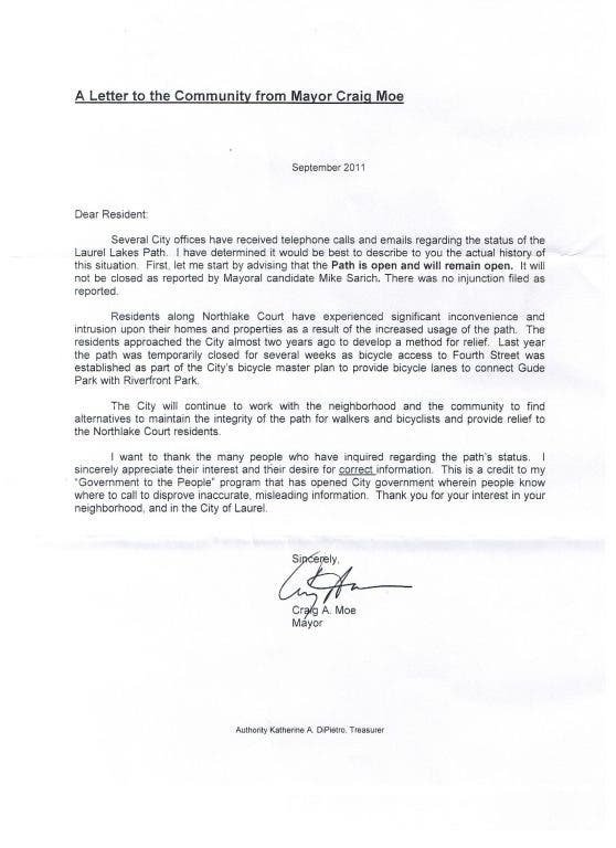 At least that is what Laurel Mayor Craig A. Moe is now saying to residents who were upset over the path earlier in the summer.