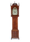 · Federal Chippendale style walnut tall-case clock, circa 1815. This timepiece features a painted dial enclosed by a broken arched bonnet with three carved finials and floral termini, and reeded quarter columnar supports.